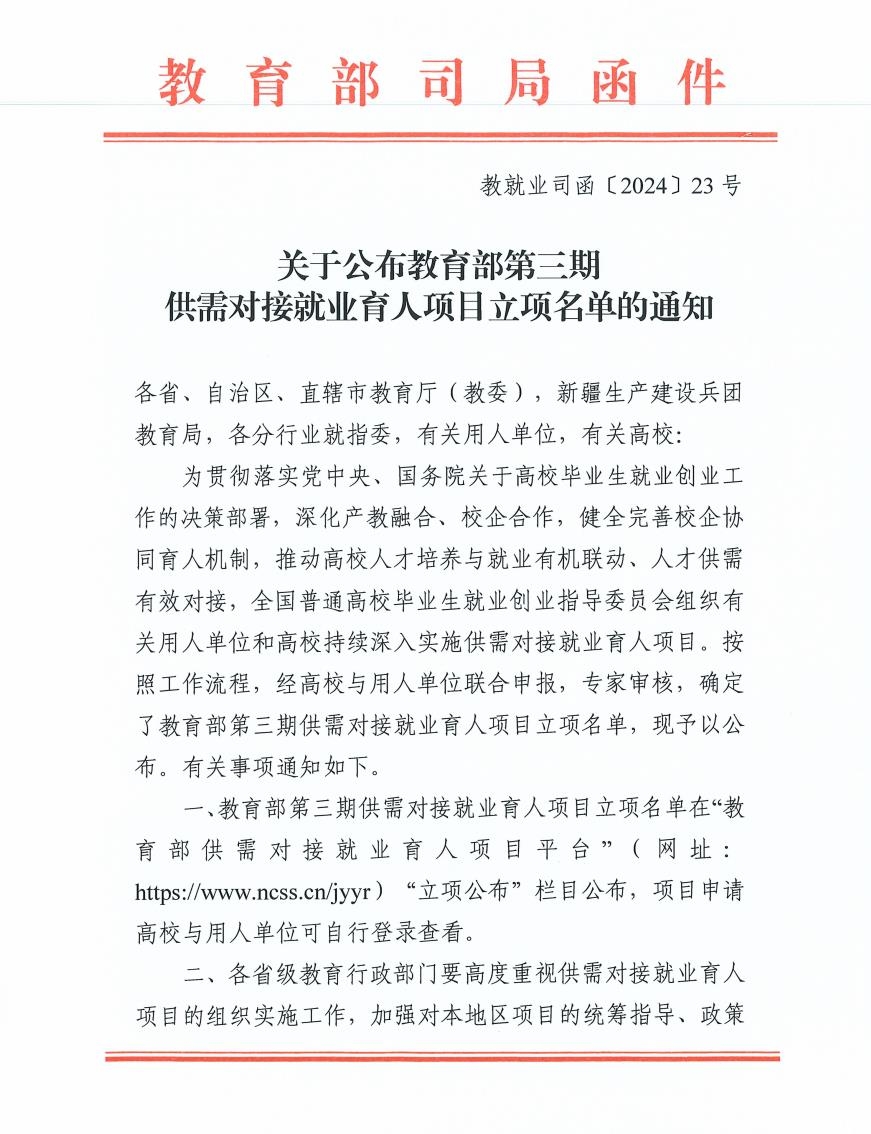 (通讯员 张佩妮)近日,教育部就业司发布《关于公布教育部第三期供需对接就业育人项目立项名单的通知》。我校经济与管理学部唐时俊副教授主持申报的《武汉城市学院“数智+创业学”虚拟教研室建设》(项目编号:2023122535413),与管理系主任何舒卉副教授主持申报的《天津耘和智能有限公司毕业生就业实习基地》(项目编号:2023122201783)成功立项。