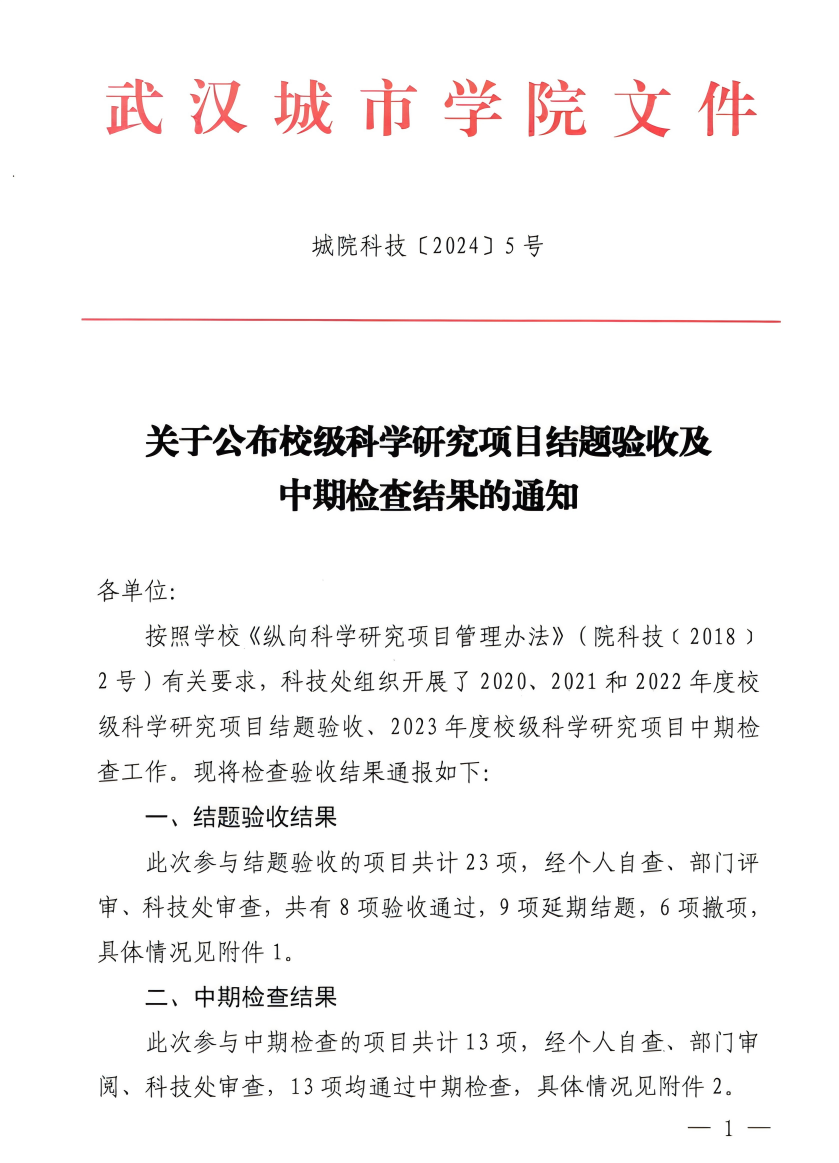 (通讯员:张佩妮)近日,校科技处发布《关于公布校级科学研究项目结题验收及中期检查结果的通知》(城院科技【2024】5号)。按照学校《纵向科学研究项目管理办法》(院科技【2018】2号)有关要求,科技处组织开展了2020、2021、2022年度校级科研项目结题验收、2023年度校级科研项目中期检查工作。