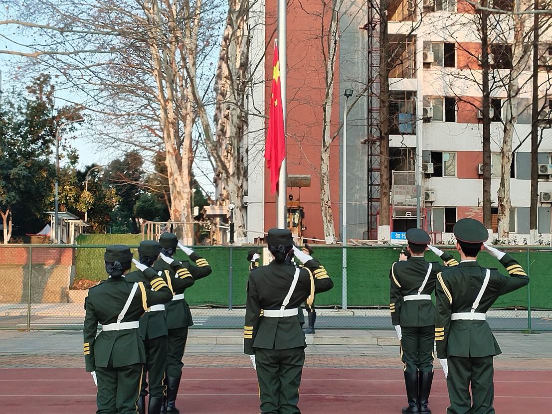 7时整,护旗手迈着矫健有力的步伐护送国旗走向升旗台。全体师生神情肃穆,所有人注视着那面鲜艳的五星红旗。激昂的国歌声响起,升旗手将国旗奋力一挥,五星红旗迎着朝阳缓缓上升,在澄澈蓝天的衬托下,显得格外鲜艳夺目 ,爱国之情在每个人心中油然而生。