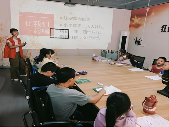 活动最后,志愿者们与孩子们一起歌唱红安革命歌谣。孩子们清澈的童声与志愿者铿锵有力的歌声交织相融,唱到“小小黄安,人人好汉。铜锣一响,四十八万。男将打仗,女将送饭”时,孩子们眼神中闪烁着炽热的光芒,歌声里满是对革命先辈的崇敬与对红色精神的传承之志。