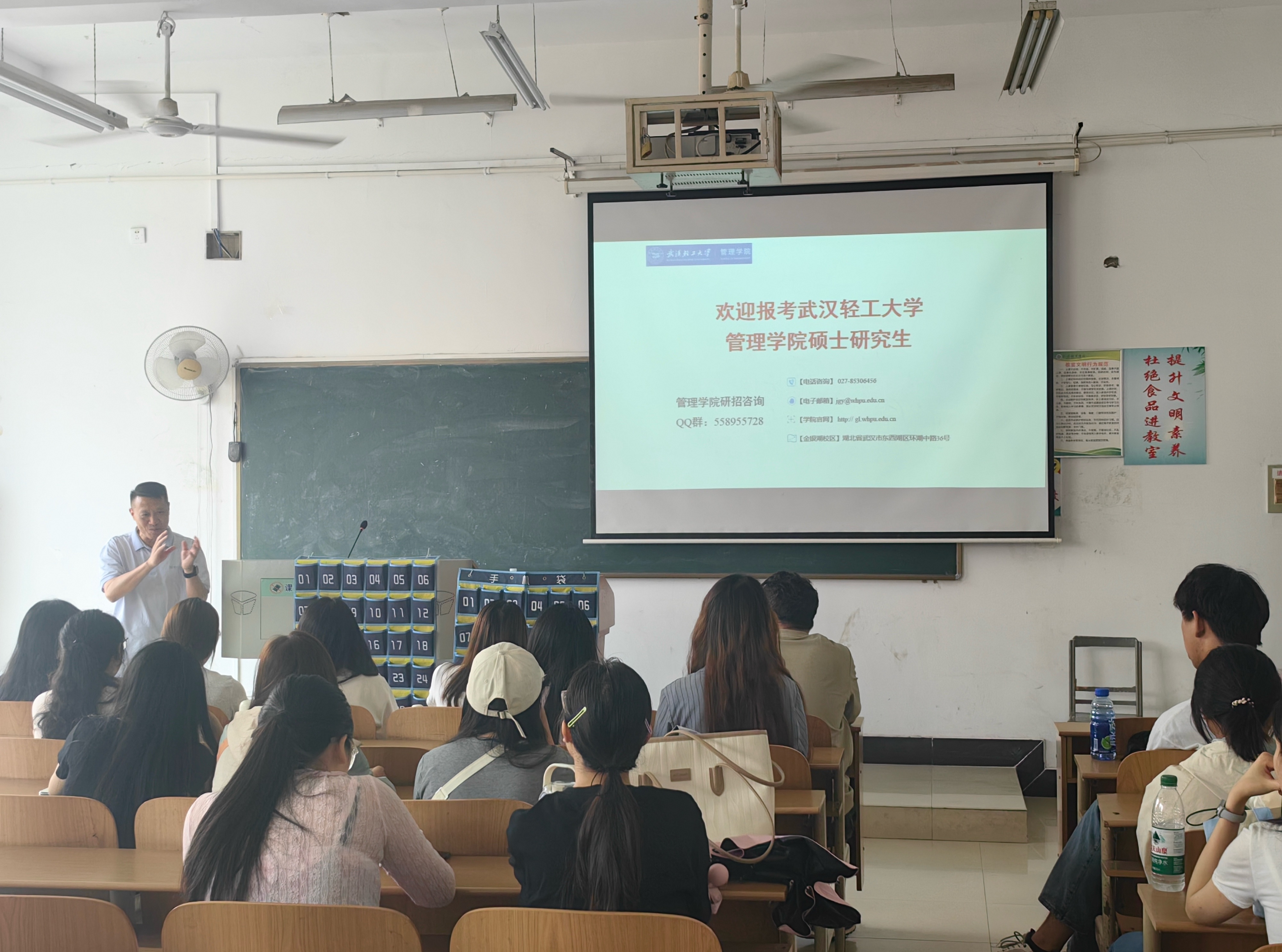 (通讯员:周琦)2025年6月6日上午10时,武汉轻工大学管理学院研究生招生宣讲会在我校3302教室成功举行。本次宣讲会旨在搭建优质研究生教育信息平台,帮助经管学子深入了解考研政策与培养特色,吸引了众多有意向深造的本科生积极参与,现场座无虚席。