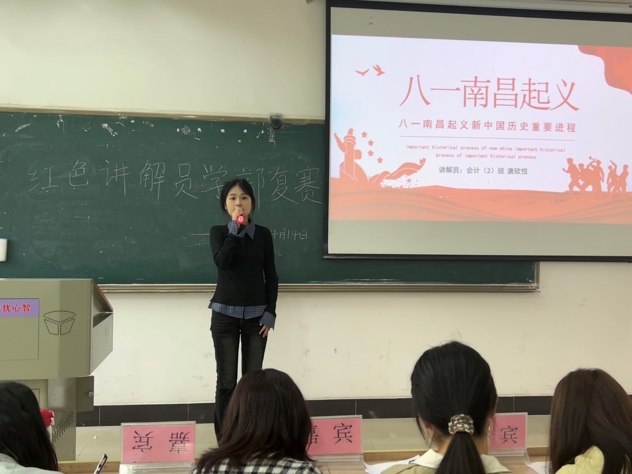 24 级会计 2 班的唐欣悦紧随其后。她手持话筒,声音清亮,将八一南昌起义的烽火岁月铺展开来。从打响武装反抗的第一枪,到人民军队的诞生,她的讲述没有空泛口号,只用一个个鲜活细节,让那段远去的历史重现眼前。