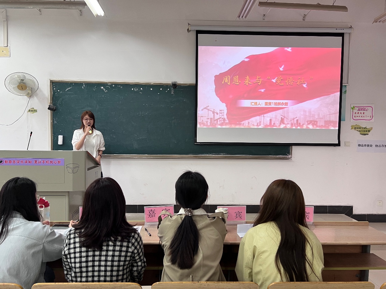 25 级国贸 1 班的郝永甜率先登台。身后投影幕布上,鲜红旗帜舒展飘扬,“周恩来与‘觉悟社’” 的字样格外醒目。她声音温和而坚定,将百年前天津青年觉醒求索的故事娓娓道来,让沉睡在史料里的名字与信念,重新有了温度、有了回响。