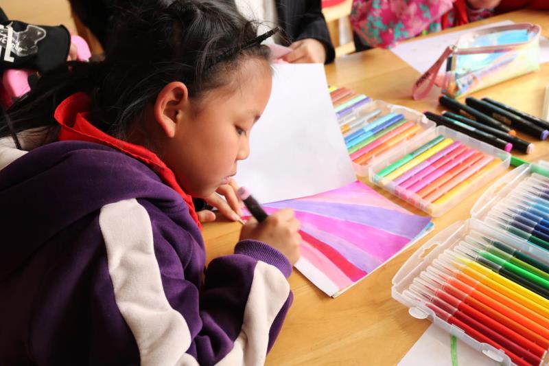 中午12.50分支教团准时集合,经过一小时的车程,便到达了目的地。在联系完老师后,志愿者们便开启了支教活动。支教内容分为绘画,书法,和舞蹈,分别在三个班级进行。首先是一楼的书法组,学生们整整齐齐地在自己的本子上练习,一个个端正的汉字呈现在眼前,这不仅是同学们认真态度的表达,更是中华优秀文化的展现。其次是二楼的绘画组,孩子们奇妙的想象力和他们的热情,五彩缤纷的颜色在画纸上构成了一幅幅美丽的画作。孩子们得作品是对世界的探索与想象,也是对未来的期待。“一恰恰,二恰恰……”紧接着三楼的舞蹈组也传来了一阵富有节奏的声音,孩子们在志愿者的教学下,学起了拉丁舞,不成熟的舞步中透露出一股子学习的劲。伴随着音乐和孩子们的欢声笑语,大家一起快乐的跳舞。