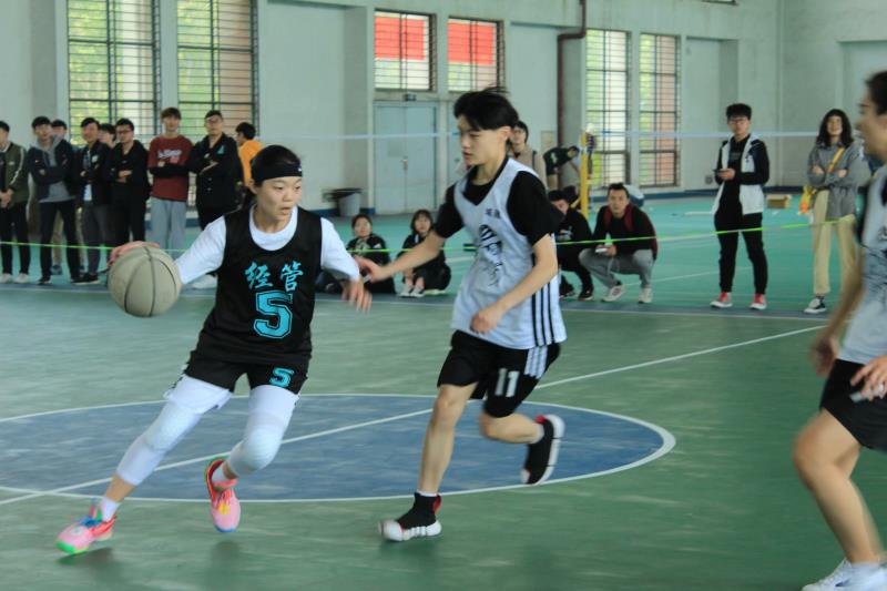 随着裁判哨声响起,我方1号球员韩蕊率先控制抛起的球,夺得先机。开场的几分钟内,场上处于胶着状态,然而几分钟后,我方5号球员蔡曼楚打破僵局,突围上篮,让比分产生了变化。我方的严密进攻使得对方无法占据有利地形,篮球在双方手中来回运转,2号孙灿在韩蕊和蔡曼楚的配合下,又为经管赢得了两分。经管队员默契的配合,敏捷的身手,闪电般的速度,使球不断落入篮筐。最终上半场结束时,经管以26:14的比分暂时领先。