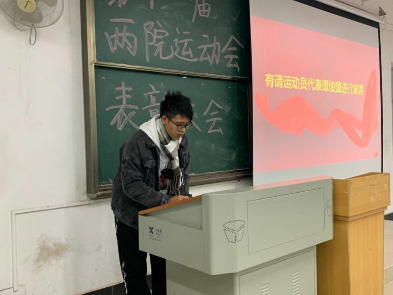 接下来是运动员代表谭俊国发言。他先是表达了自己获奖与被选为代表的激动,并对支持运动员们的同学与老师表示最真诚的感谢。之后,谭俊国声情并茂地讲述了自己训练的历程,反思了自己在比赛中的不足,并且表明了他对未来的展望,争取明年再铸辉煌。随后是获奖运动员们的颁奖仪式,由吴千千主席与金灿主席为运动健儿们颁发荣誉证书,并给他们戴上奖牌。