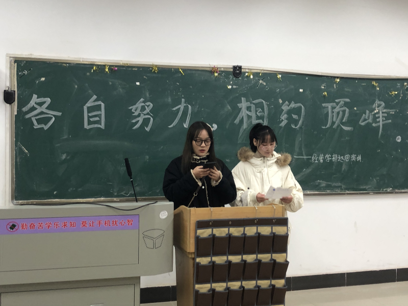 经管学部分团委新闻宣传部讯(记者 李云龙 郑欣茹 陈明轩)小雪初过,气温骤降。随着同学们的衣服一层一层的加厚,课程也正在一节一节的接近尾声,期末的压力随之而来。为了让同学们能够更加积极,更加正确的学习,经济与管理学部于11月26日晚举行了:“各自努力,相约顶峰”的经管学部巡回演讲活动,学部特邀“国家奖学金获得者”俞旭娇同学和“综合素质标兵”李智分别给20级的各班同学进行演讲,分享她们的学习经历和学习经验。让同学们能够以一个良好的状态来迎接接下来的挑战。