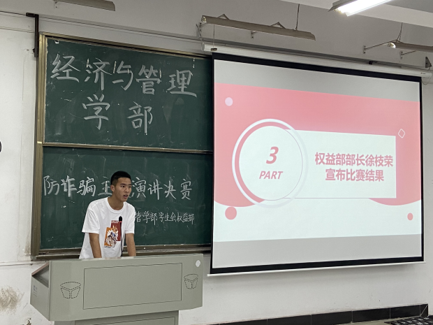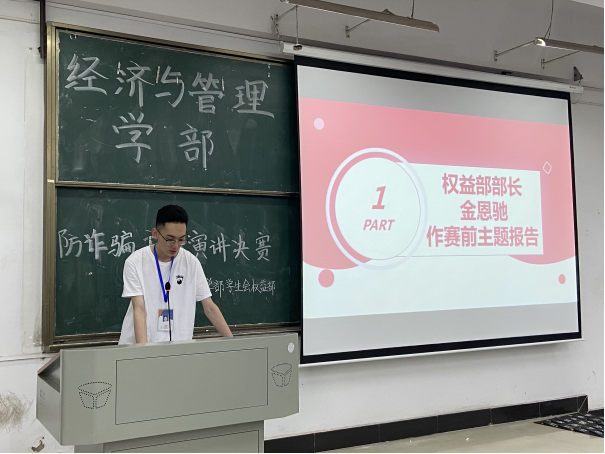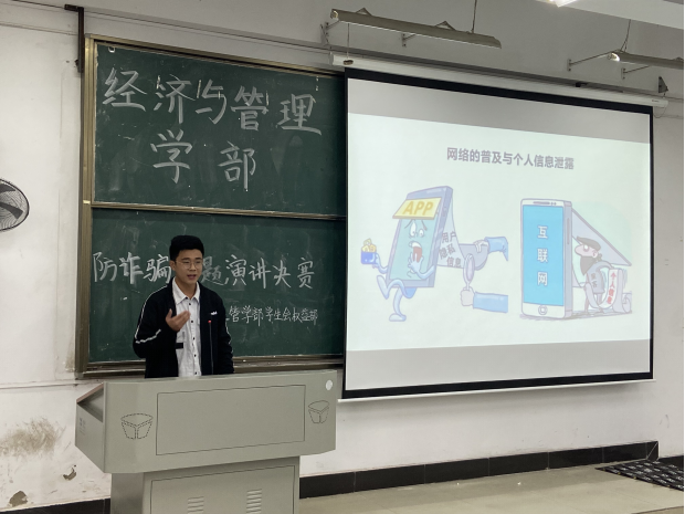 经管分团委新闻宣传部讯(记者:盛琦琦 金彩)为了加强同学们防诈骗的防范意识,2021年5月21日中午12点,经济与管理学部在南6201教学楼举行了以谨防诈骗,自我保护为主题的演讲比赛。