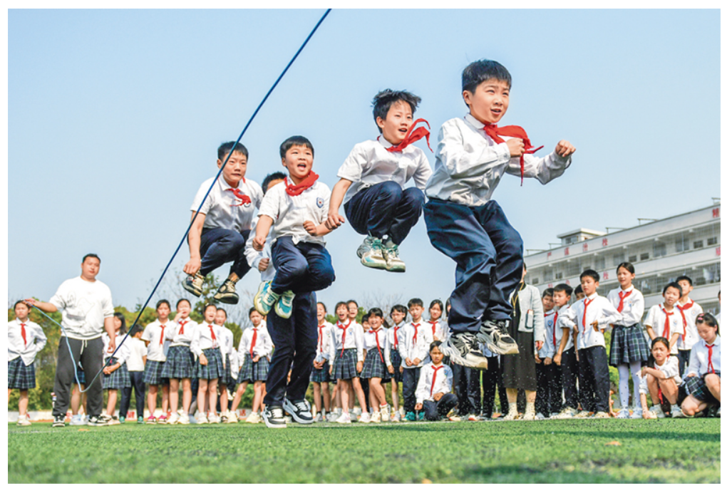 近年来,各地中小学积极落实“健康第一”教育理念,实施学生体质强健计划,让学生更加健康、阳光、自信地成长。图为2025年3月25日,湖南省永州市道县朝阳小学,学生们在课间跳长绳。 (人民图片 蒋克青/摄)