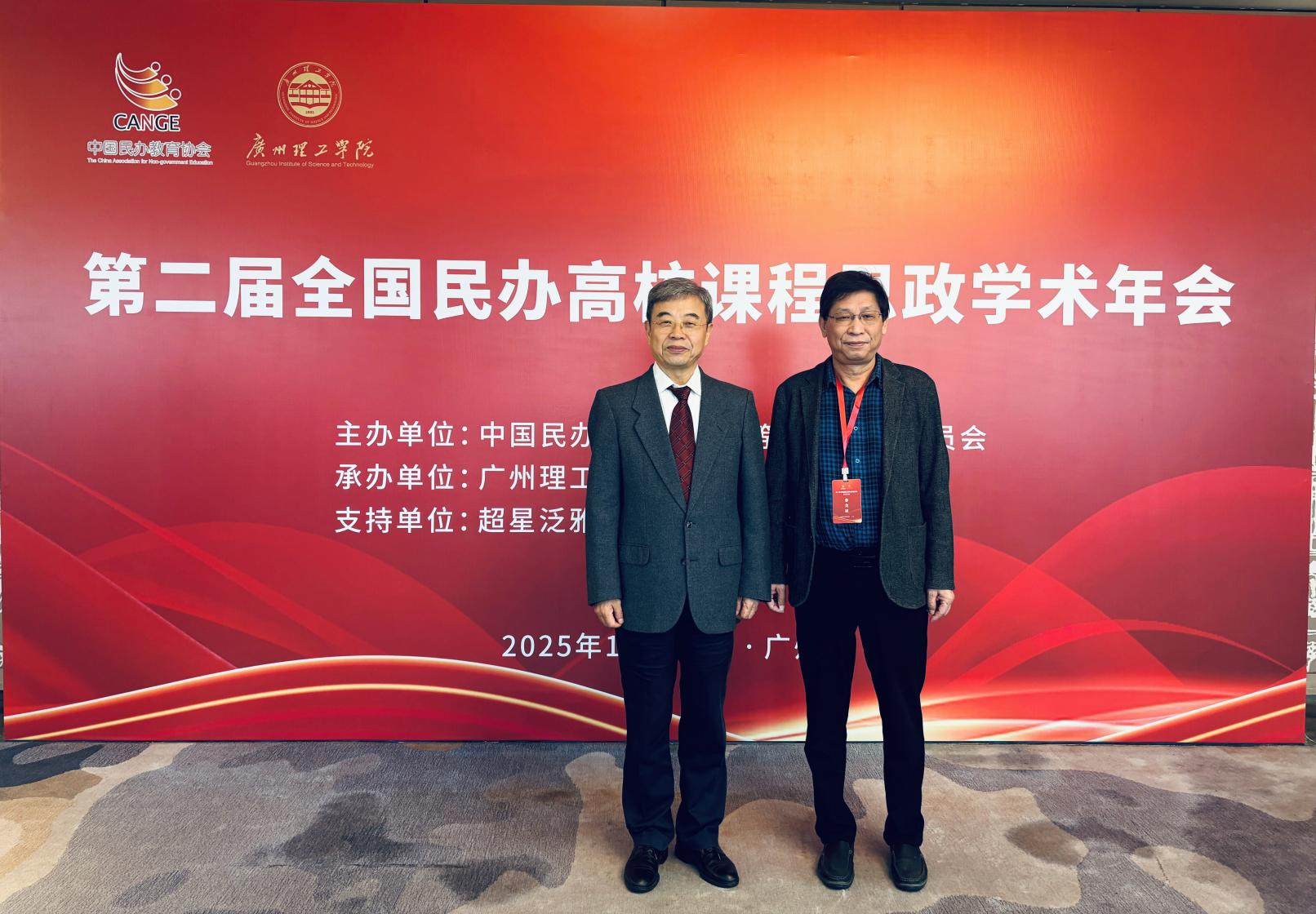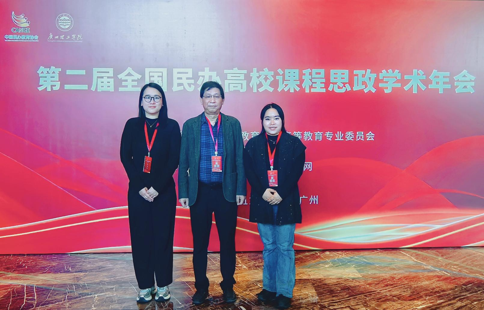 (文字、图片:熊晶)2025 年 12 月 20 日,第二届全国民办高校课程思政学术年会在广州隆重召开。本次年会以 “新思想领航 大思政铸魂” 为主题,由广州理工学院承办,吸引全国 111 所民办高校的 350 余名教师代表齐聚一堂,围绕课程思政建设的发展方向、实施路径、实践创新等核心议题展开深度交流研讨。我校高度重视课程思政建设工作,副校长王军带队参会,课程思政教学研究中心办公室主任熊晶和中心研究员、经济与管理学部管理系主任何舒卉受邀随行,共赴这场学术盛会。