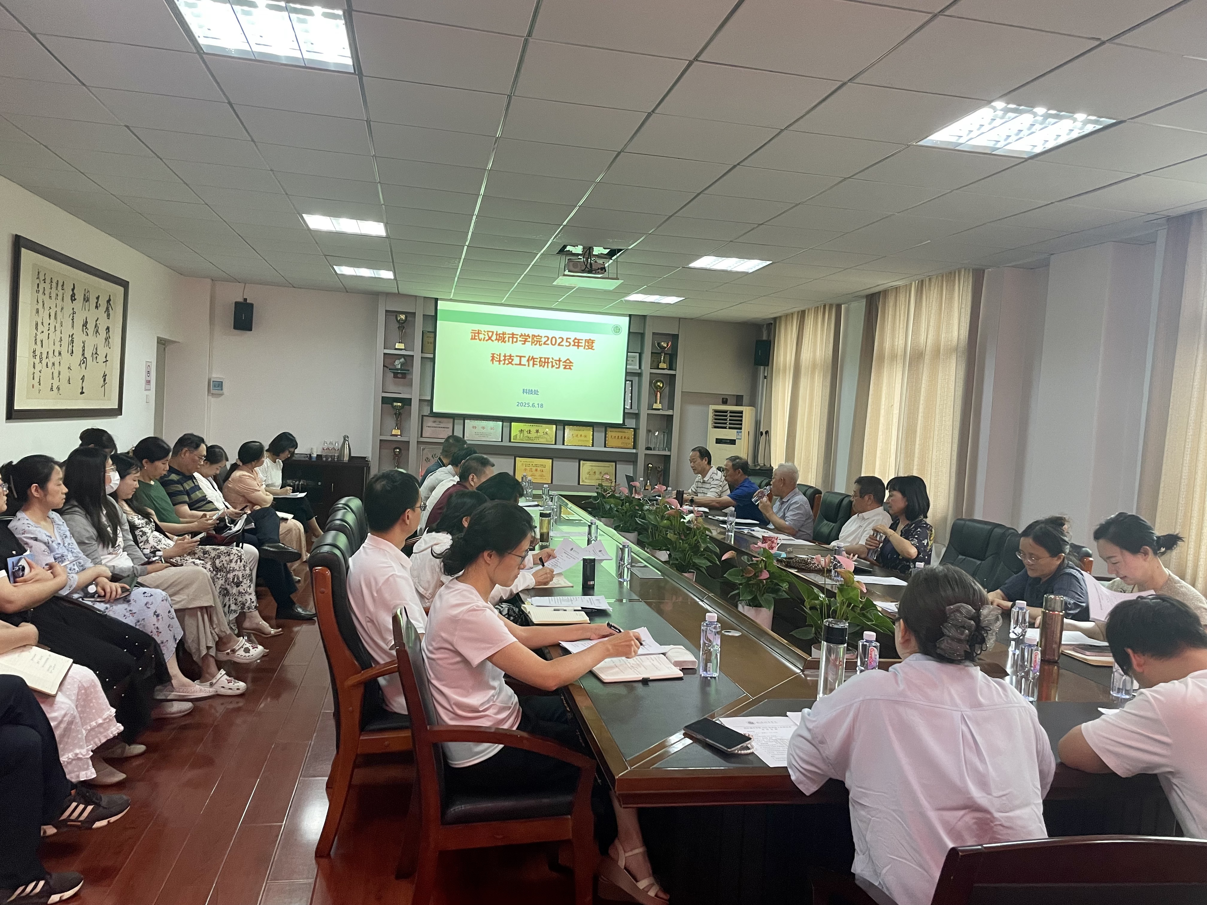 为系统总结近年来学校科研工作成效,谋划未来发展路径,提升科技创新能级,营造更好的科研氛围,6月18日下午 14:30,武汉城市学院 2025 年科技工作研讨会在行政楼 A315 会议室隆重召开。本次会议由科技处处长张双喜主持,赵光红副校长出席会议并发表重要讲话,各学部主任、科研分管负责人、科研秘书及科技处全体成员参加了会议。