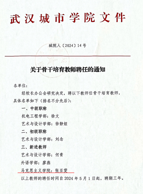 经学院评选、审核,我院教师张亚雯荣获2024年骨干培育教师(城院人〔2024〕14号)。这是对我院教师教育教学水平和专业能力的充分肯定,也是对我院教育事业的有力推动。