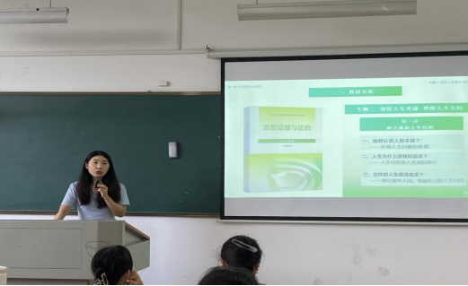 彭丽洁老师围绕《思想道德与法治》课程专题二“树立高尚人生目的”这一节内容,从“如何认识人的本质”、“人为什么要有所追求”、“怎样的人生值得追求”三个方面展开来进行说课展示。在教学导入环节,彭丽洁运用电视剧《西游记》里唐僧这一角色的自我介绍导入新课,引导学生思考“我是谁?”。在“正确认识人的本质”部分,为了引导学生更好理解马克思主义关于人的本质的认识,彭丽洁以网络流行文化“搭子”为切入点,说明了人的本质是一切社会关系的总和。最后,以习近平总书记的重要论述为根本指引,讲解说明了帮助大学生树立正确的世界观、人生观、价值观的重要性。