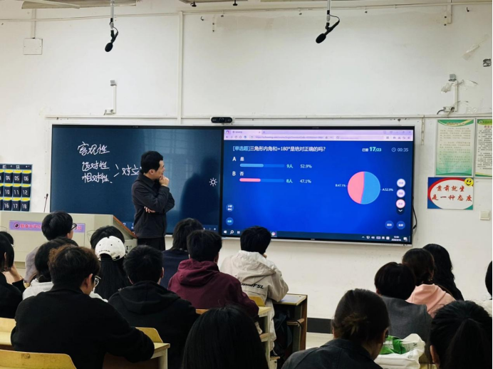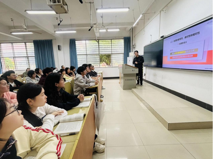 本次公开课以“真理及其特性”为授课主题。邹正洋以亚里士多德的AI数字人形象为导入,引发学生对“真理何物”产生兴趣。课堂上,邹正洋注重师生互动,灵活运用多样化数字工具辅助教学,在紧扣教材核心知识点的同时,有机融入中国式现代化和“一带一路”等鲜活实践案例。邹正洋以学生在校园生活中容易出现的矛盾问题为切入点,将“真理”的抽象哲学原理讲得具体、通俗,风趣,引导学生从现实生活中理解真理的内涵,把握真理的辩证属性,树立实事求是、追求真理的科学态度。