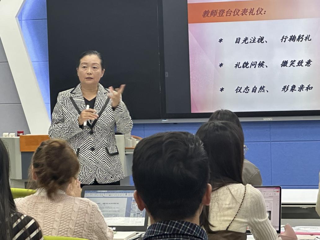 当天下午的教学礼仪培训,特邀武汉轻工大学副教授、湖北省礼仪学会第一副会长、武汉公共关系协会常务副会长杨丹担任主讲嘉宾。杨教授以“讲坛新风与教学技法”为主题,围绕“形象力:讲坛仪表风范”和“传授力:课堂教学技法”两大板块,为教师们带来了一场精彩纷呈的现场教学。