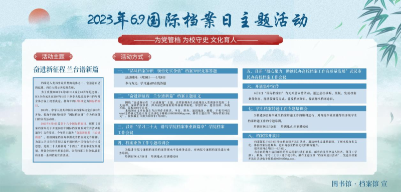 (通讯员 程灏璠)今年6月9日是第十六个国际档案日,按照《国家档案局关于开展2023年国际档案日系列宣传活动的通知》文件要求,今年的主题为“奋进新征程兰台谱新篇”。根据国家档案局和湖北省档案局文件精神,为深入学习宣传贯彻习近平新时代中国特色社会主义思想、党的二十大精神及“十四五”档案事业发展规划,增强全校师生档案意识、宣传档案工作价值,档案馆进行了形式多样的宣传工作。
