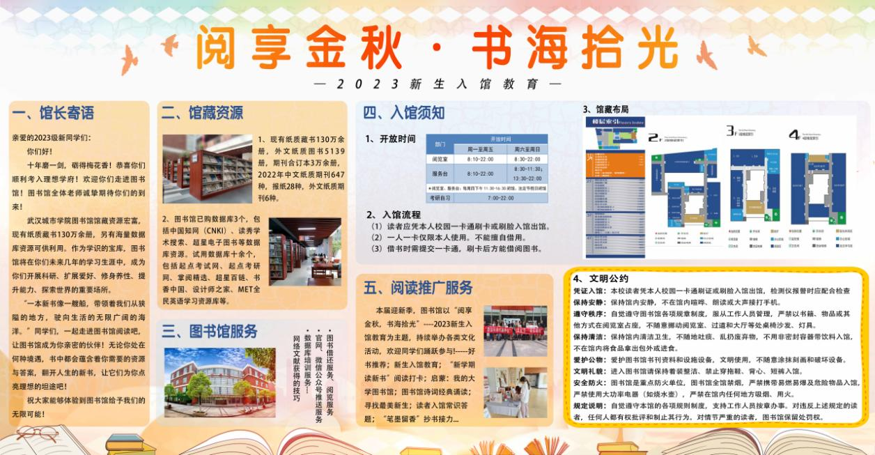 展板一内容为图书馆入馆教育,旨在为学生入馆提供帮助和指导,包括馆长寄语、馆藏资源介绍、图书馆服务、入馆须知及阅读推广服务等。展板二内容为开学季图书馆阅读推广系列文化活动。目前,好书推荐、“新学期 读好书”阅读打卡、新生入馆教育三项活动已圆满结束;诗词经典诵读表演、“启蒙:我的大学图书馆”读书分享、寻找最美新生、“文明书香伴我行”入馆答题、笔墨留香抄书接力等活动已收到诸多学生的报名和投稿作品,仍在火热进行中。