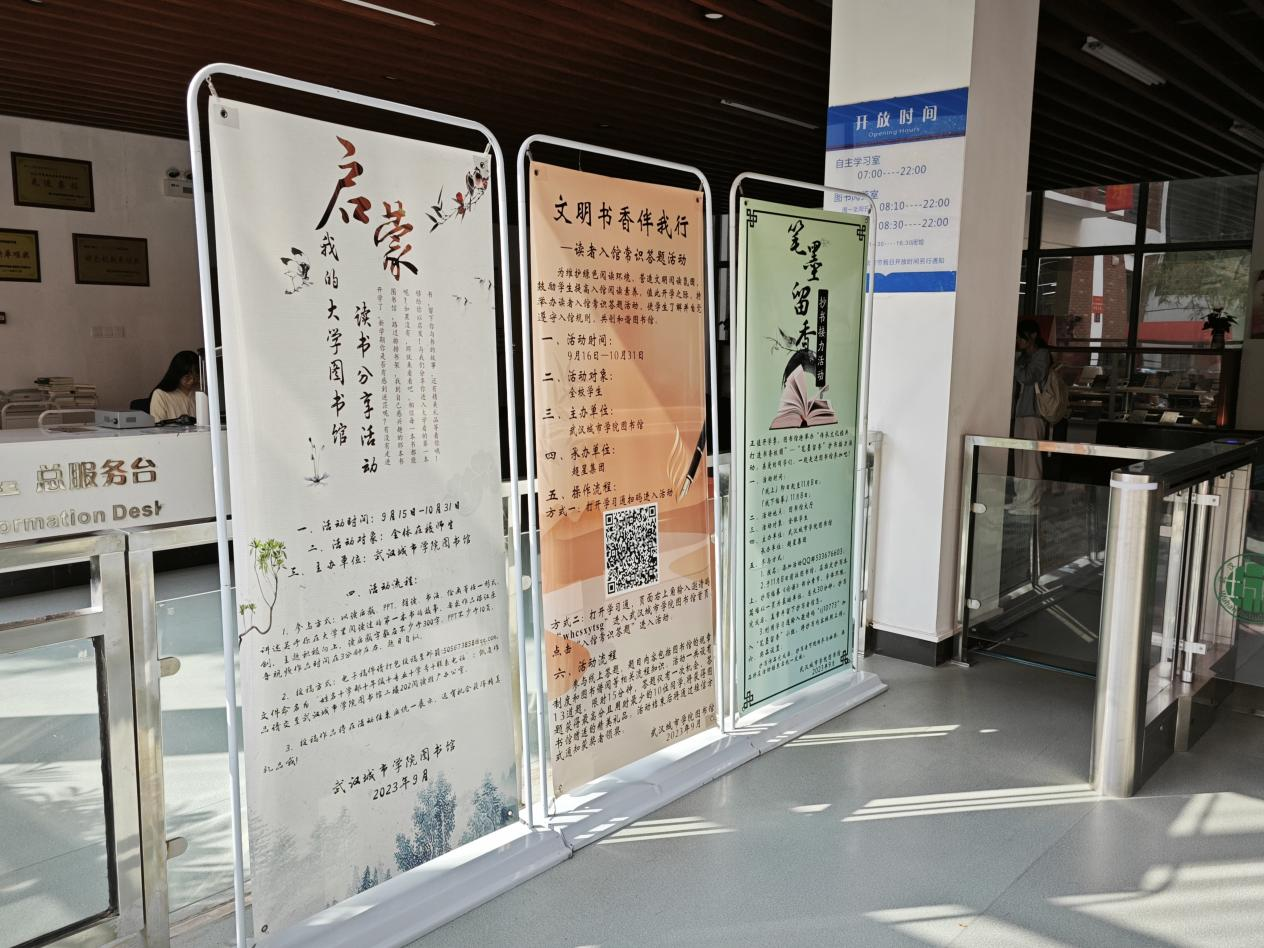 除宣传板外,图书馆还通过悬挂迎新横幅,陈设活动海报,以及在图书馆微信公众号、官网及超星学习通上发布相关宣传内容等方式,为学子了解并熟悉图书馆,踊跃参与校园活动,提高阅读文化素养提供多元化渠道和支撑。