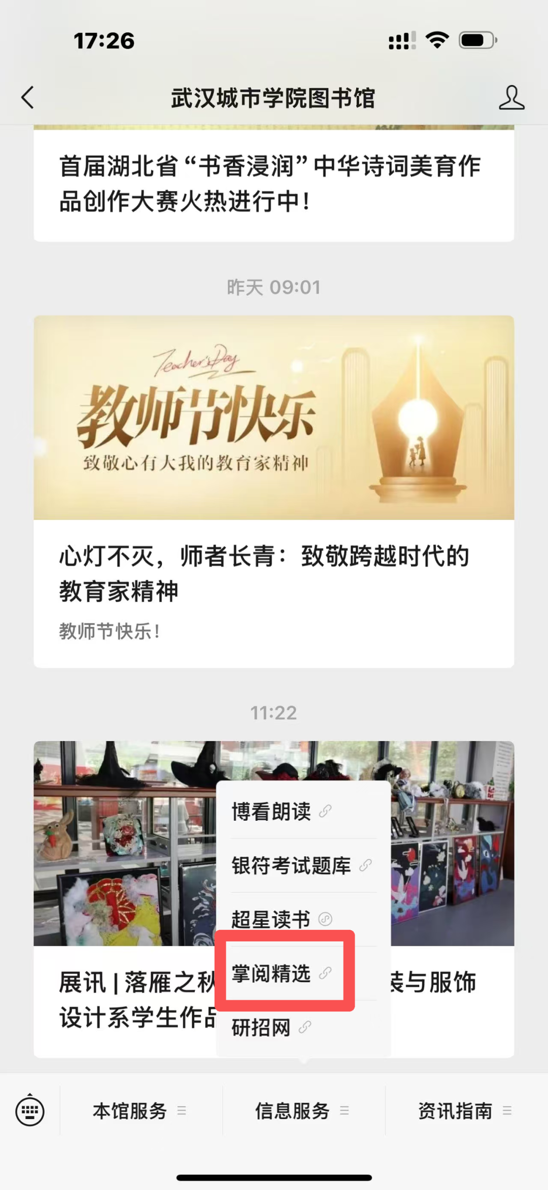 方式二:搜索武汉城市学院图书馆微信公众号平台,点击下方的信息服务——掌阅精选进入。
