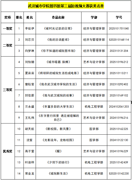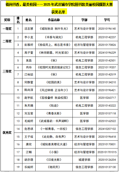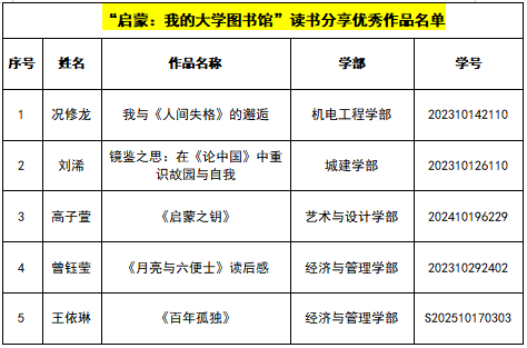 (通讯员 何臣兢)金秋送爽,书香满园。为欢迎2025级新同学,记录校园美好生活,引导读者了解和利用馆藏资源和服务,图书馆自本学年以来特举办“阅读启航,书续芳华”——2025年开学季迎新阅读推广系列活动。经过评审小组对参赛作品的公平、公正与审慎评审,现揭晓活动获奖信息如下: