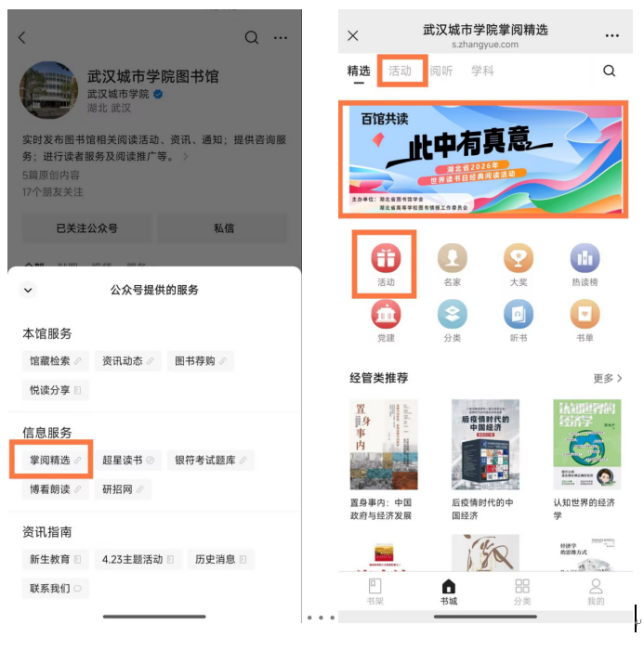 方式二:微信搜索武汉城市学院图书馆微信公众号,底部菜单栏---信息服务---掌阅精选。