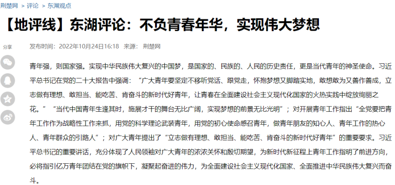 新闻网讯 10月22日,党的二十大胜利闭幕;10月23日,新一届中央领导集体产生。喜讯传来,我校上下精神振奋、信心满怀。10月24日,我校党委书记王军在省级媒体荆楚网发表理论文章——《不负青春年华实现伟大梦想》,畅谈学习领悟党的二十大报告精神体会,受到广泛关注。