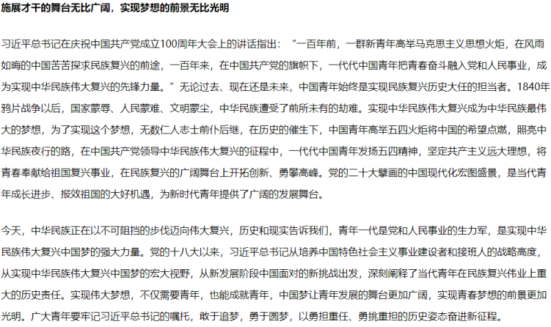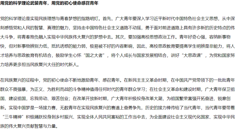 青年强,则国家强。实现中华民族伟大复兴的中国梦,是国家的、民族的、人民的历史责任,更是当代青年的神圣使命。习近平总书记在党的二十大报告中强调:“广大青年要坚定不移听党话、跟党走,怀抱梦想又脚踏实地,敢想敢为又善作善成,立志做有理想、敢担当、能吃苦、肯奋斗的新时代好青年,让青春在全面建设社会主义现代化国家的火热实践中绽放绚丽之花。”“当代中国青年生逢其时,施展才干的舞台无比广阔,实现梦想的前景无比光明”;对开展青年工作指出“全党要把青年工作作为战略性工作来抓,用党的科学理论武装青年,用党的初心使命感召青年,做青年朋友的知心人、青年工作的热心人、青年群众的引路人”;对广大青年提出了“立志做有理想、敢担当、能吃苦、肯奋斗的新时代好青年”的重要要求。王军深入学习习近平总书记的重要讲话,充分感受到人民领袖对广大青年的浓浓关怀和殷切期望,作为高校党委书记,更觉使命重大,更加明确了开展新时代新征程上青年工作前进的方向。