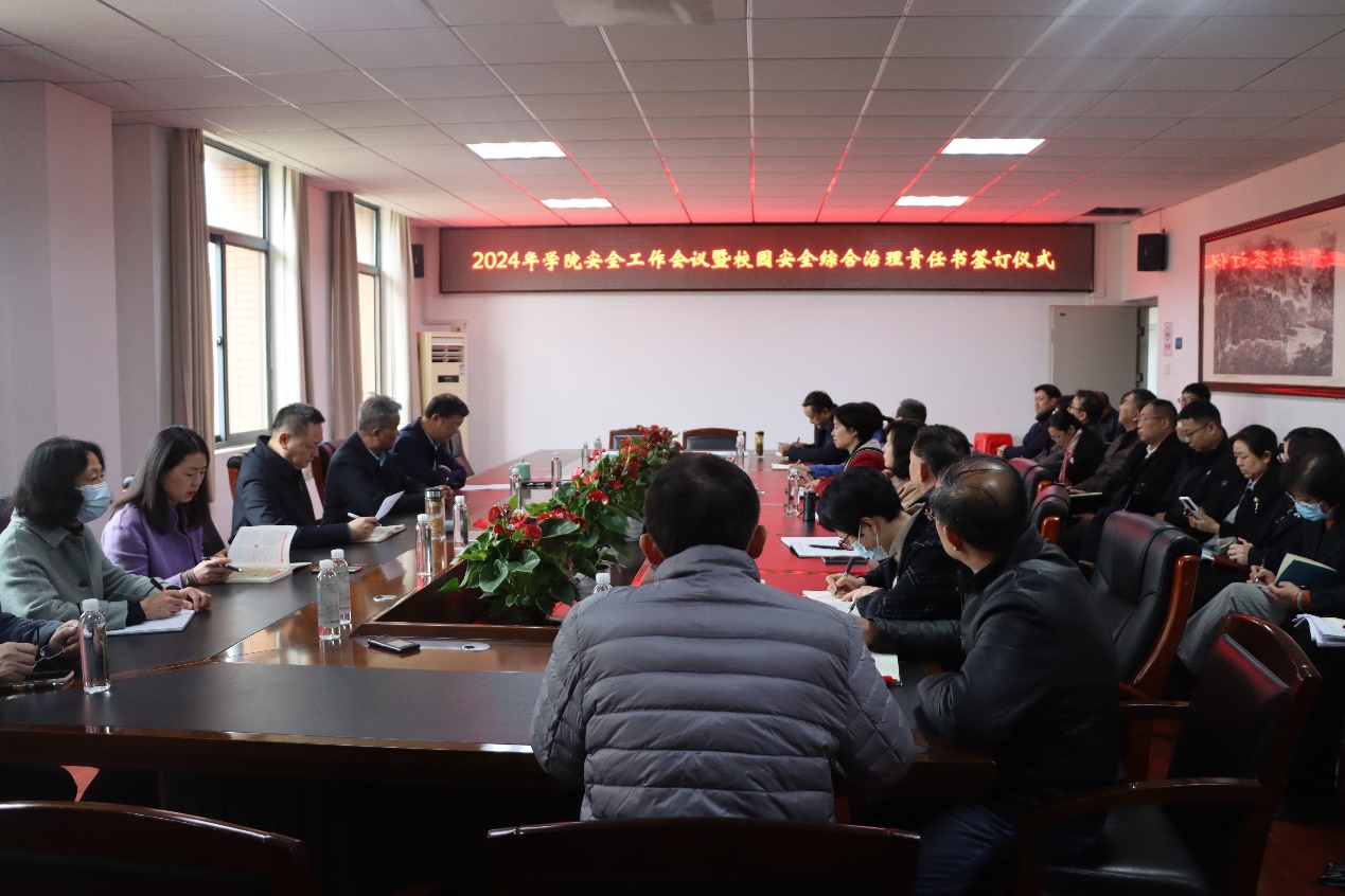 新闻网讯(记者曹诗章 杨玉萱)3月25日,学院召开2024年安全工作会暨校园安全综合治理责任书签订仪式。部署2024年平安校园建设与安全工作对策,进一步压实安全责任,筑牢校园安全防线。院长陈建勋、党委书记肖军及各职能部门、各学部负责人参加会议。会议由副院长彭邦银主持。