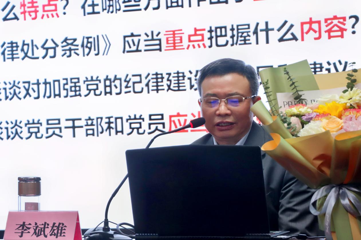 随后,李斌雄教授以“中国共产党纪律处分制度的新发展——2023年《中国共产党纪律处分条例》解读”为题作专题辅导报告。他围绕什么是党的纪律处分制度、为什么要修订党纪处分条例、如何把握党纪处分条例的新规定三个方面阐释、解读《中国共产党纪律处分条例》的含义、结构和功能,并通过具体案例揭示了《中国共产党纪律处分条例》在实际操作中的价值和影响。指出各级党组织和广大党员必须把学习贯彻新修订的《条例》作为重要政治任务,在服务党和国家大局中学习领会《条例》的主旨要义;加强党纪学习教育,增强遵规守纪自觉;敢于善于斗争,严格精准执纪;不断推动全面从严治党向纵深发展。