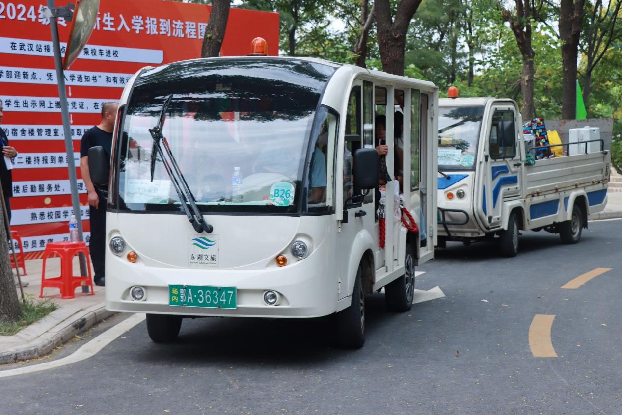 上午九点三十分,校长陈建勋、党委书记肖军等校领导深入迎新现场,充分了解迎新工作情况,慰问迎新工作人员及志愿者,确保新生们无误完成报到的全部流程。为方便新生搬运大件行李,我校与东湖风景区管委会积极协商沟通并借用了6辆旅行观光车及运输车前往宿舍楼,最大限度为新生带来货运便利。
