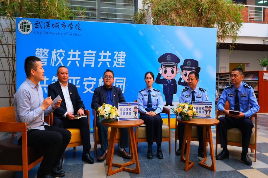 在警校共建平安校园联席座谈的主会场,武汉市公安局文化保卫局民警韩怡婷,武汉城市学院学生工作处处长严建、保卫处处长廖高军,东湖生态旅游风景区分局网安大队负责人胡家强,武汉城市学院责任区民警魏红胜齐聚活动现场,围绕警校联动、共建共享和深度融合等议题展开深入交流。