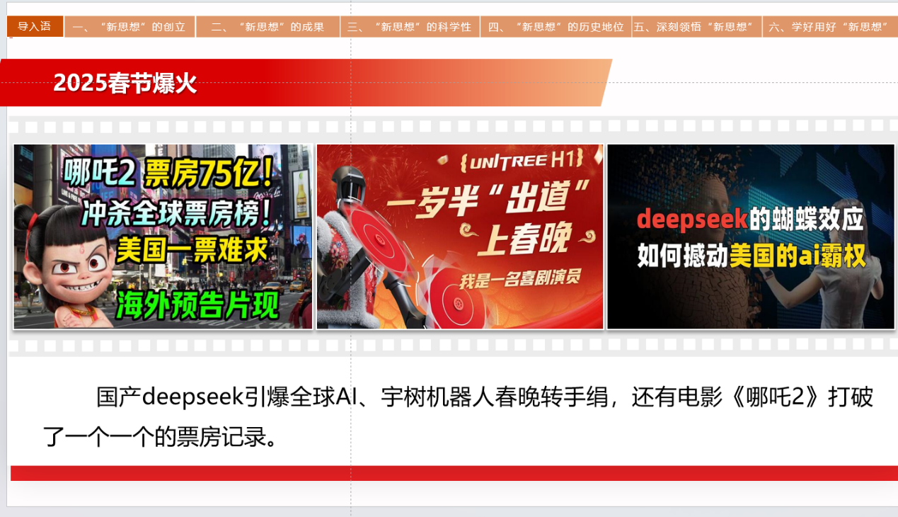 新闻网讯(记者 唐欣)新学期的第一节思政课,马克思主义学院的老师们不讲大道理,而是将近期刷屏的热搜事件——中国AI公司DeepSeek搅动美股风云、《哪吒2》的赛博朋克龙宫、春晚机器人秧歌表演等时政热点巧妙融入课堂,为同学们呈现了一堂堂"接地气"的思政课,牢牢抓住了同学们的注意力。
