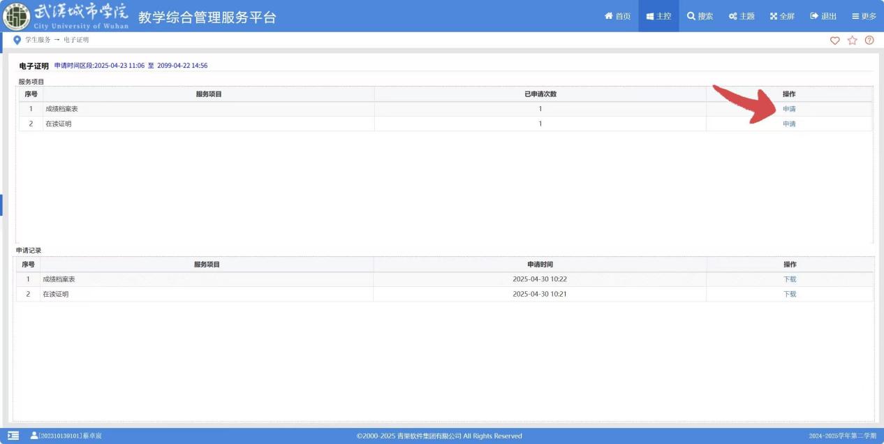 点击申请后,在下方“申请记录”一栏中会弹出已申请的“成绩档案表/在读证明”,点击“操作”一栏中的【下载】。