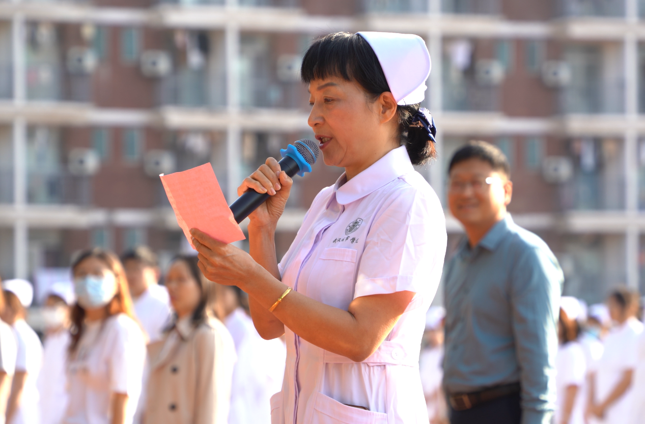 宣誓结束后,医学部常务副主任肖琛嫦发表讲话。她向选择护理事业的同学们致以敬意,以“专业、生命、初心”为核心告诫全体学生,一是夯实基础,在学习和实践中打磨自己,将理论与实践深度融合,注重细节,积极参与竞赛和志愿活动,积累经验,让专业成为职业底气;二是敬畏生命,以专业托举生命重量,对生命心怀敬畏,将 “以人为本” 融入操作与沟通;三是不忘初心,在医疗技术飞速发展时代,既拥抱新技术,又坚守人文内核。并希望同学们以“探索、坚守、创新”三把 “钥匙”,助其实现初衷与理想,早日成为优秀护理人才。