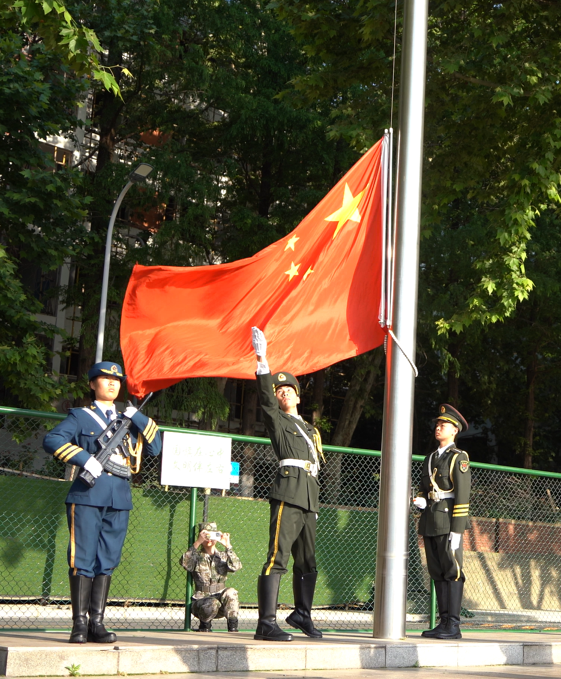 升旗仪式开始,雄壮激昂的国歌声奏响,鲜艳五星红旗缓缓升起,迎风飘扬。全体学生目光坚定,庄严肃立,向国旗行注目礼。
