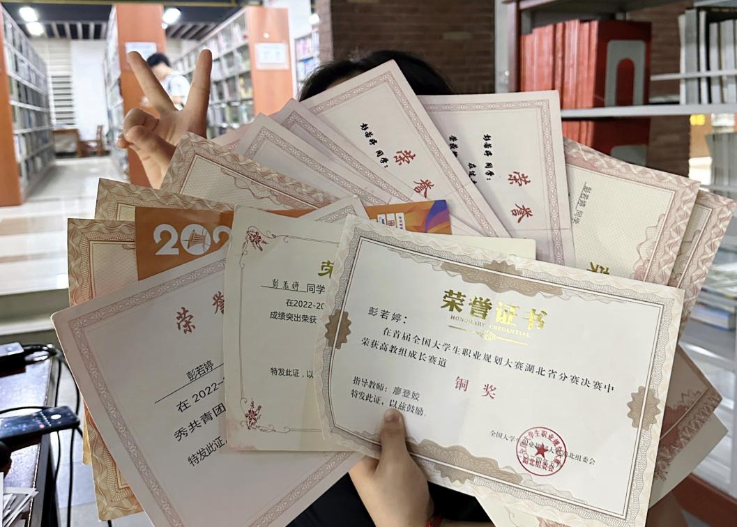 在专注学生工作的同时,彭若婷始终将学业放在首位,专业和德育成绩稳居第一,荣获38项奖学金和荣誉称号。在学科竞赛的赛场上,彭若婷同样展现出了非凡的勇气与实力。大一时参加大学生广告设计大赛的失利,不仅没有让她退缩,反而成为了她前进的动力。大二起,她积极参加各类竞赛,不断突破自我。在首届大学生职业规划大赛中,她凭借出色的表现荣获省级三等奖;在挑战杯全国大学生课外学术科技作品竞赛中荣获省级三等奖;在2025年中国计算机设计大赛中,面对仅有35天创作时间的紧张挑战,她在图书馆结识的伙伴介绍下,迅速组建了5人团队。确定作品雏形后,团队成员每晚面对面深入沟通,反复打磨细节,并在5天内多次向指导老师请教修改。作为团队统筹者,彭若婷带领大家攻坚克难,最终以3张系列作品斩获省级二等奖并入围国奖。大学三年,她共收获了4个重量级奖项、9个省级奖项以及36个校级奖项。
