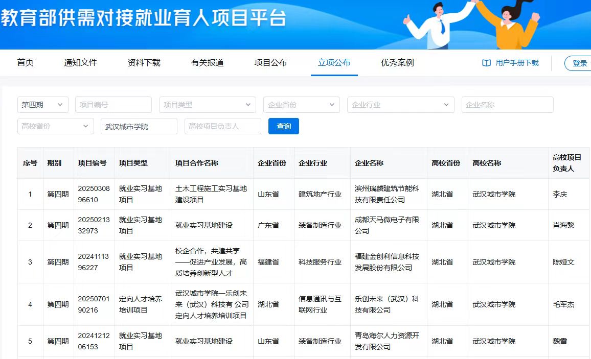 新闻网讯(通讯员 李治)近日,教育部公布2025年第四期供需对接就业育人项目立项名单,我校10个项目成功获批立项。项目类型涉及定向人才培养培训项目(2项)、人力资源提升项目(1项)、就业实习基地项目(7项),是学校深化产教融合、优化人才培养模式、汇聚更多社会力量共同做好高校毕业生就业工作的重要成果。