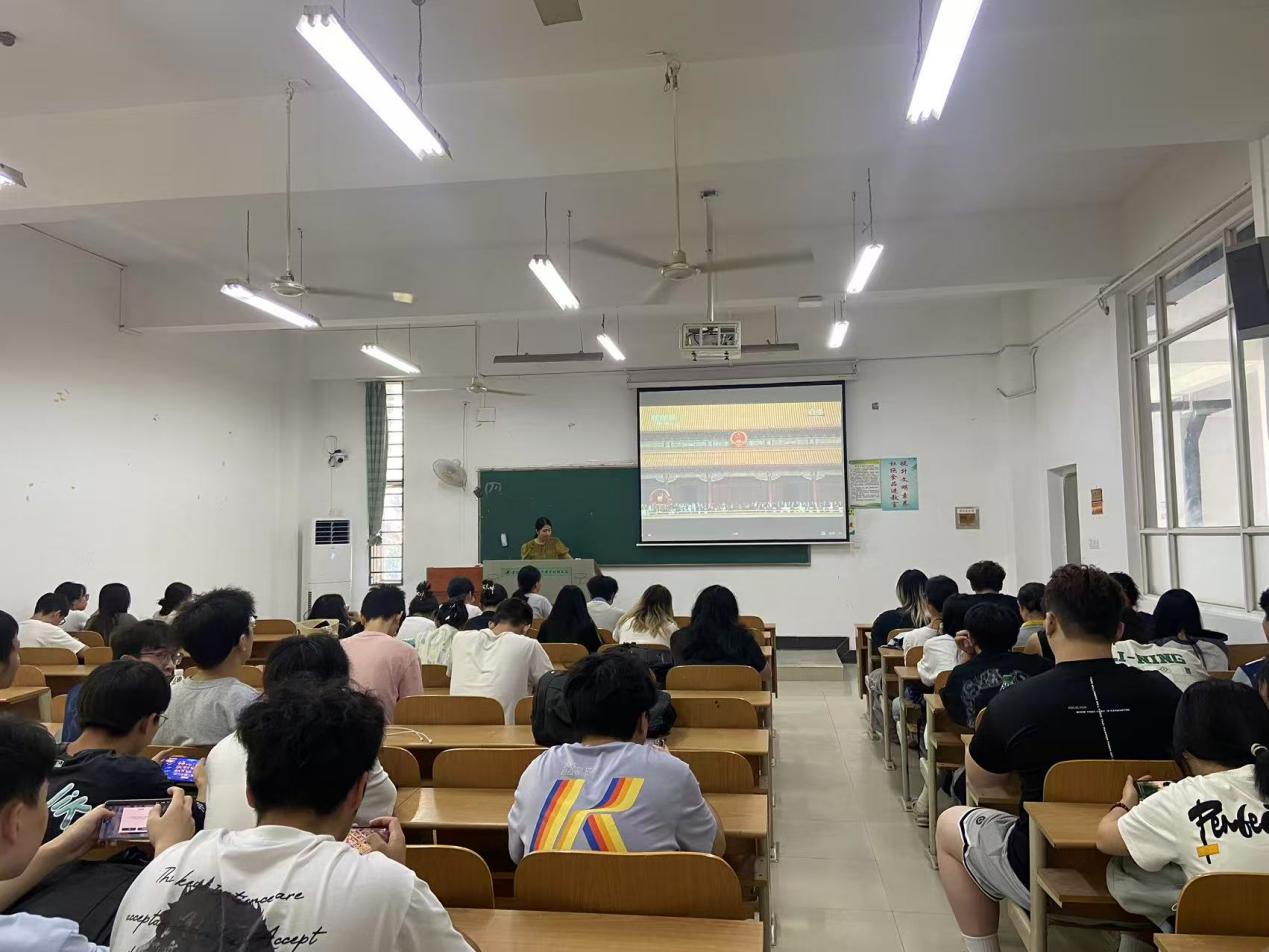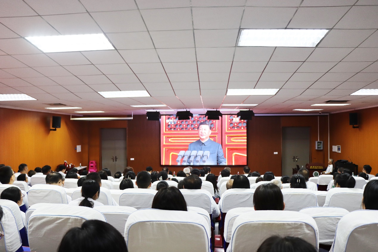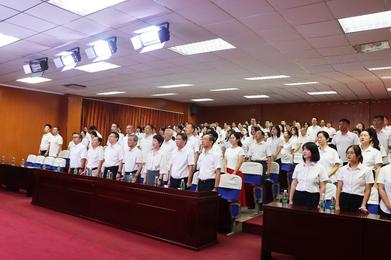 南一2号报告厅内,校领导和教职工们身着统一白色衬衫,气氛庄重肃穆,当屏幕中鲜艳的五星红旗冉冉升起,全场肃立,行注目礼,以最崇高的敬意向国旗致敬。
