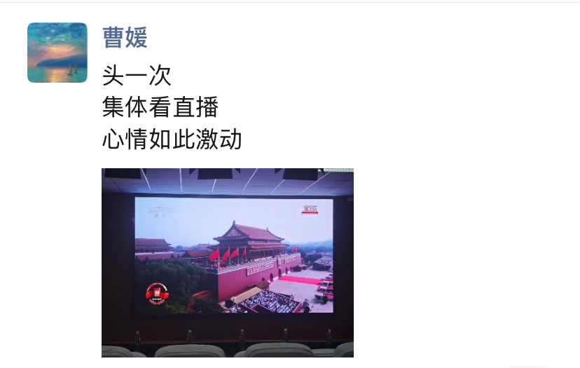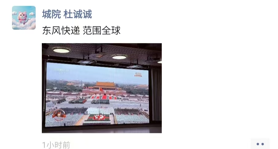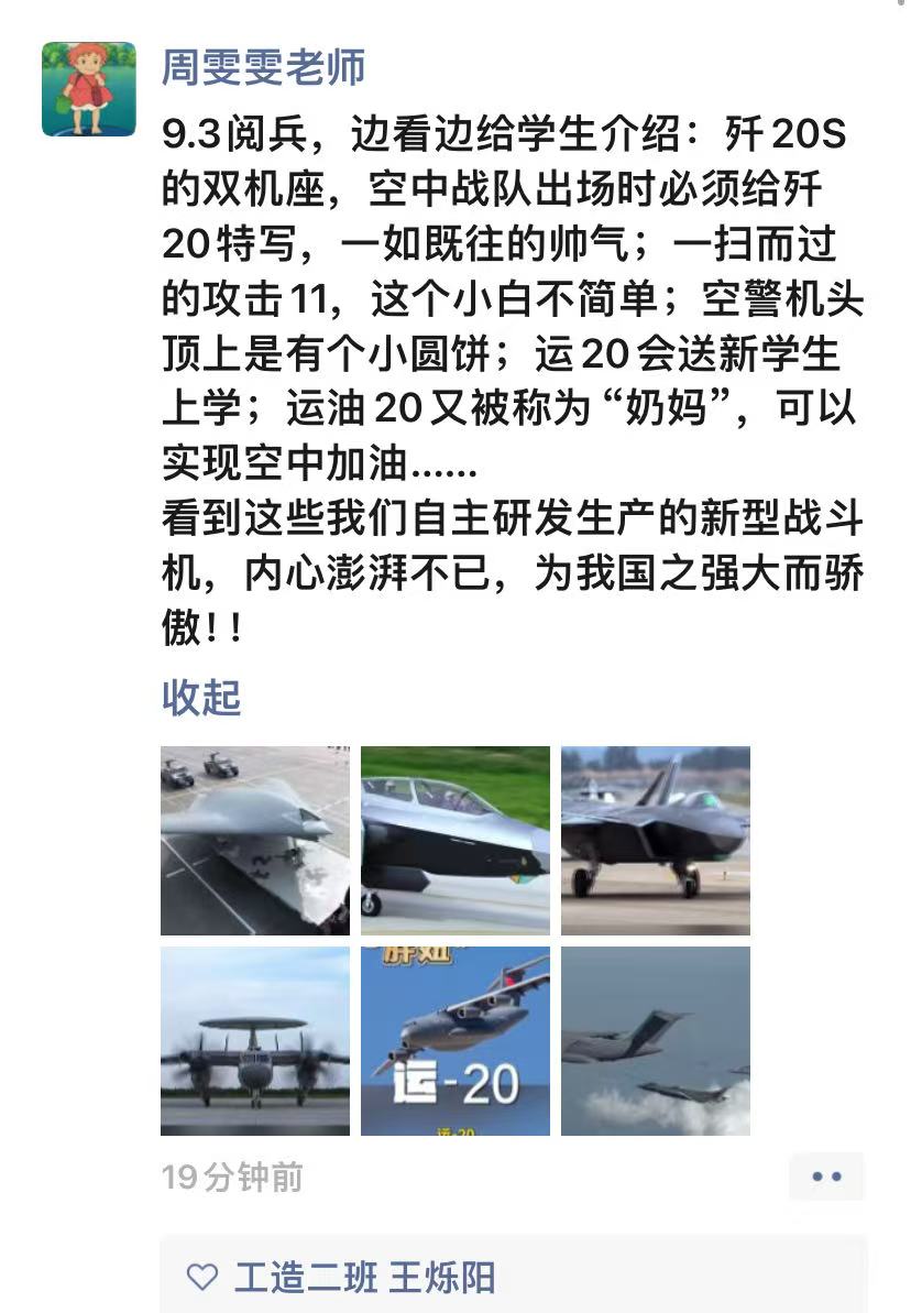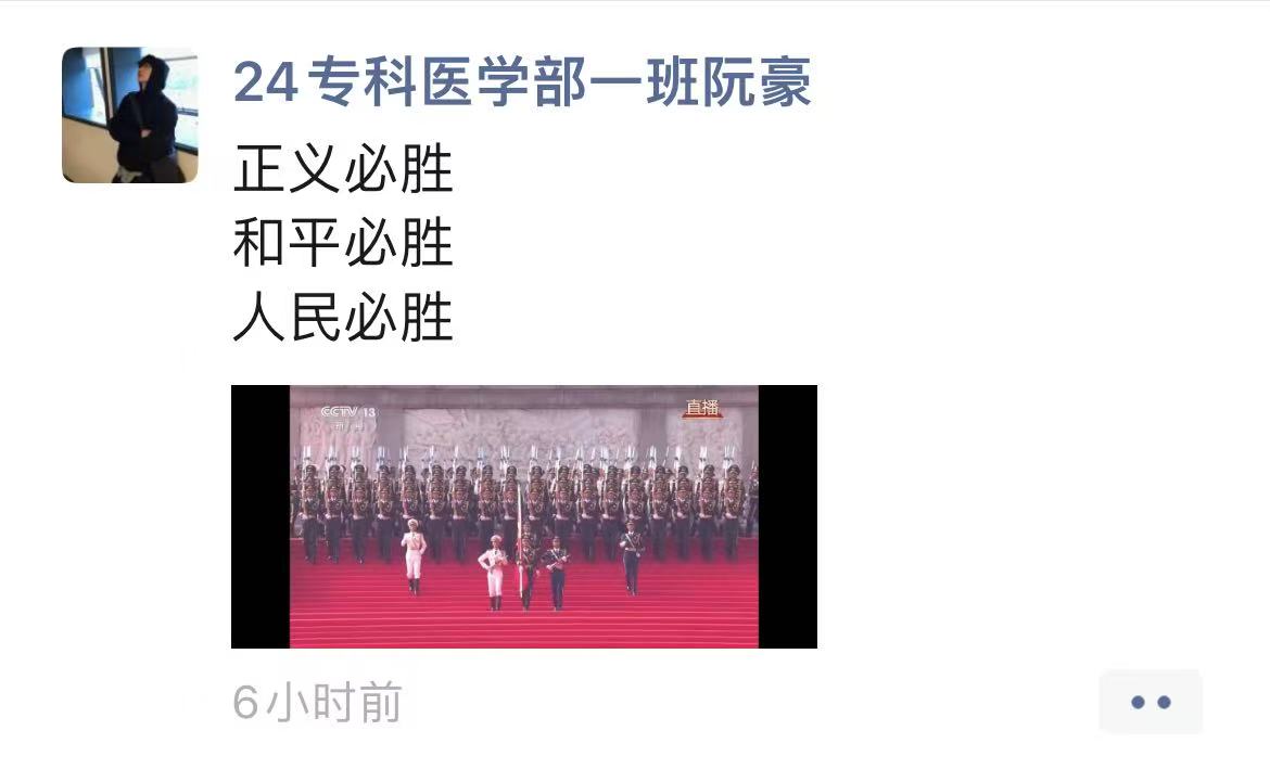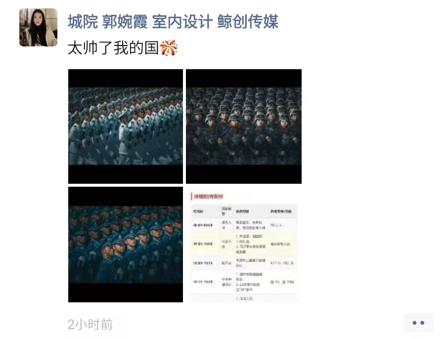 师生的朋友圈迅速被阅兵盛况“刷屏”。师生们纷纷晒出观看的照片,配文表达激动心情。在校学生们更是创意十足,有的制作了阅兵精彩瞬间的九宫格图片,有的截取震撼视频片段配发感言。毕业生校友虽身在各地,但同样心系盛典。“太帅了我的国!”“热泪盈眶的一天”等成为高频配文。这些来自不同身份、不同地域的实时分享,构筑起一道独特的情感风景线,展现着我校师生校友深厚的家国情怀和强烈的民族自豪感。