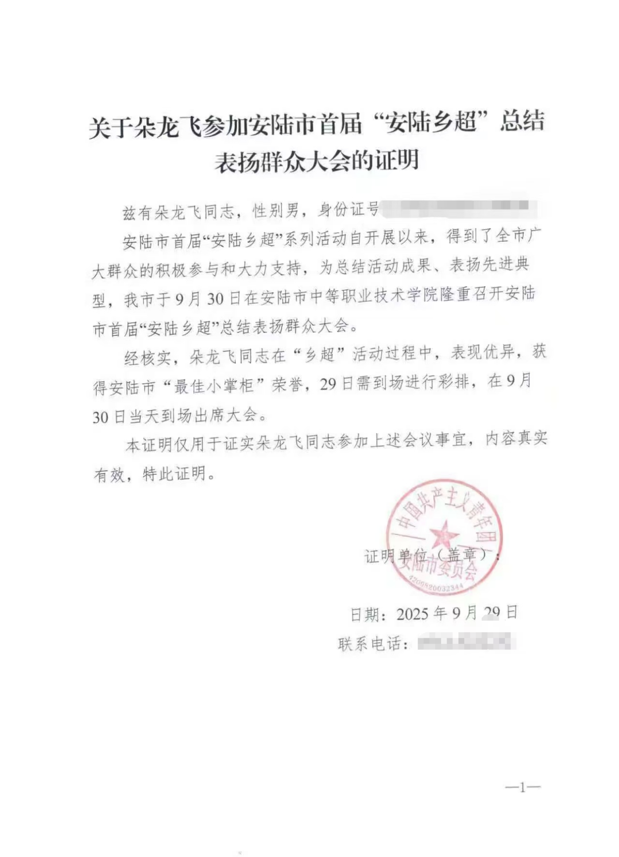 国庆节前夕,朵云飞因先前被报道的救人善举,受安陆市团市委邀请参加家乡的“安陆乡超”乡镇足球联赛系列活动。“当时我还在学校,就接到了安陆市相关工作人员的电话,问我是否有兴趣参与家乡‘安陆乡超’的系列活动。”收到邀请的朵云飞格外激动,“这是半公益性质的活动,能为家乡出份力,我当然愿意。”他欣然应允。活动期间,朵云飞始终保持积极活跃的状态,主动认领各项任务。凭借亮眼的实际表现与主动担当的态度,他最终获评 “乡超小掌柜” 称号。