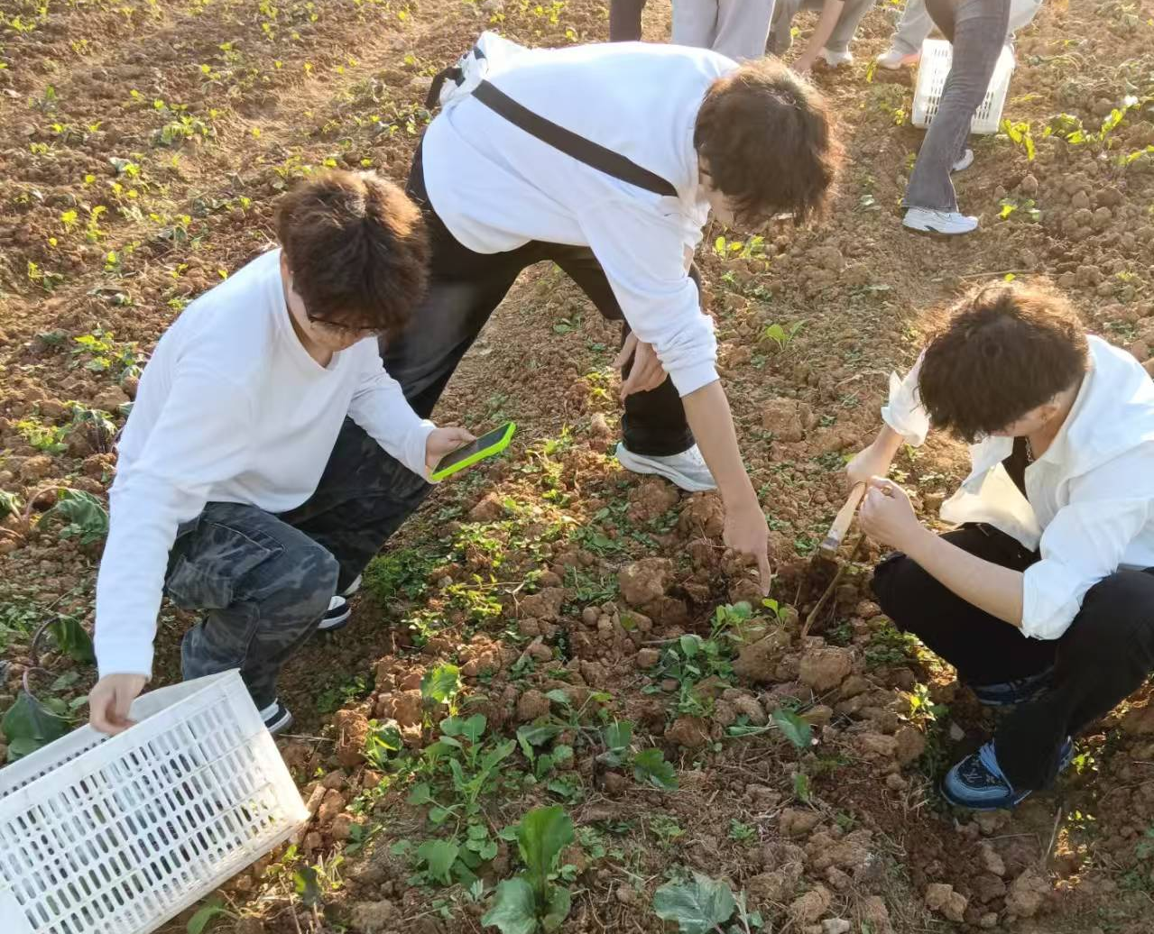 在田间地头,同学们热情高涨地投入到各项农事活动中:齐心协力栽种小巧的多肉植物,俯身弯腰在田垄间亲手栽下洪山菜苔的幼苗,在蔬菜大棚里小心翼翼地用剪刀收割香榧,三五成群地在秋收后的红薯地里挥动小锄头,兴致勃勃地翻找藏于泥土中的红薯……这些对多数同学而言前所未有的新鲜体验,极大地激发了他们的参与热情。在园区技术员的指导下,他们认真熟悉着各种现代农业工具,俯身于苗床之间,专注地进行多肉移植、月季栽种、香榧采割等农事活动。