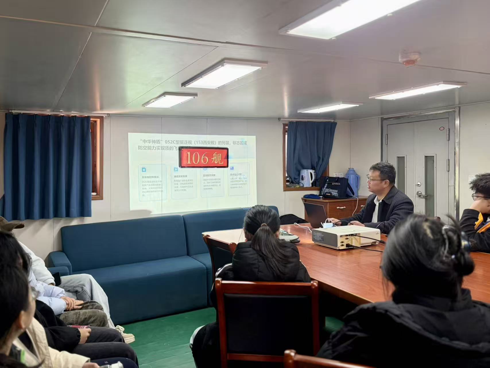 本次特色思政课全程于106舰开展,课堂阵地直接设在军舰内部会议室,让同学们在浸润式场景中感悟初心使命。课前同学们自主围绕106舰历史沿革、国防建设意义、青年使命担当等核心方向精心筹备PPT学习成果,在资料深挖与课件打磨中,提前筑牢对红色历史与家国大义的认知根基。王祖法说:“我们利用这样的一个授课方式可以提高学生的参与度,让他们可以参与到我们的思政课中来,更重要的是提高学生的眼界。”