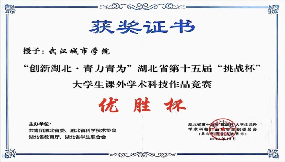 新闻网讯(通讯员 卢诗琪 杨优)近日,“创新湖北·青力青为”湖北省第十五届“挑战杯”大学生课外学术科技作品竞赛团体奖项正式公布。我校荣获竞赛团体荣誉“优胜杯”,充分彰显了学校办学质量与双创教育的扎实成果。