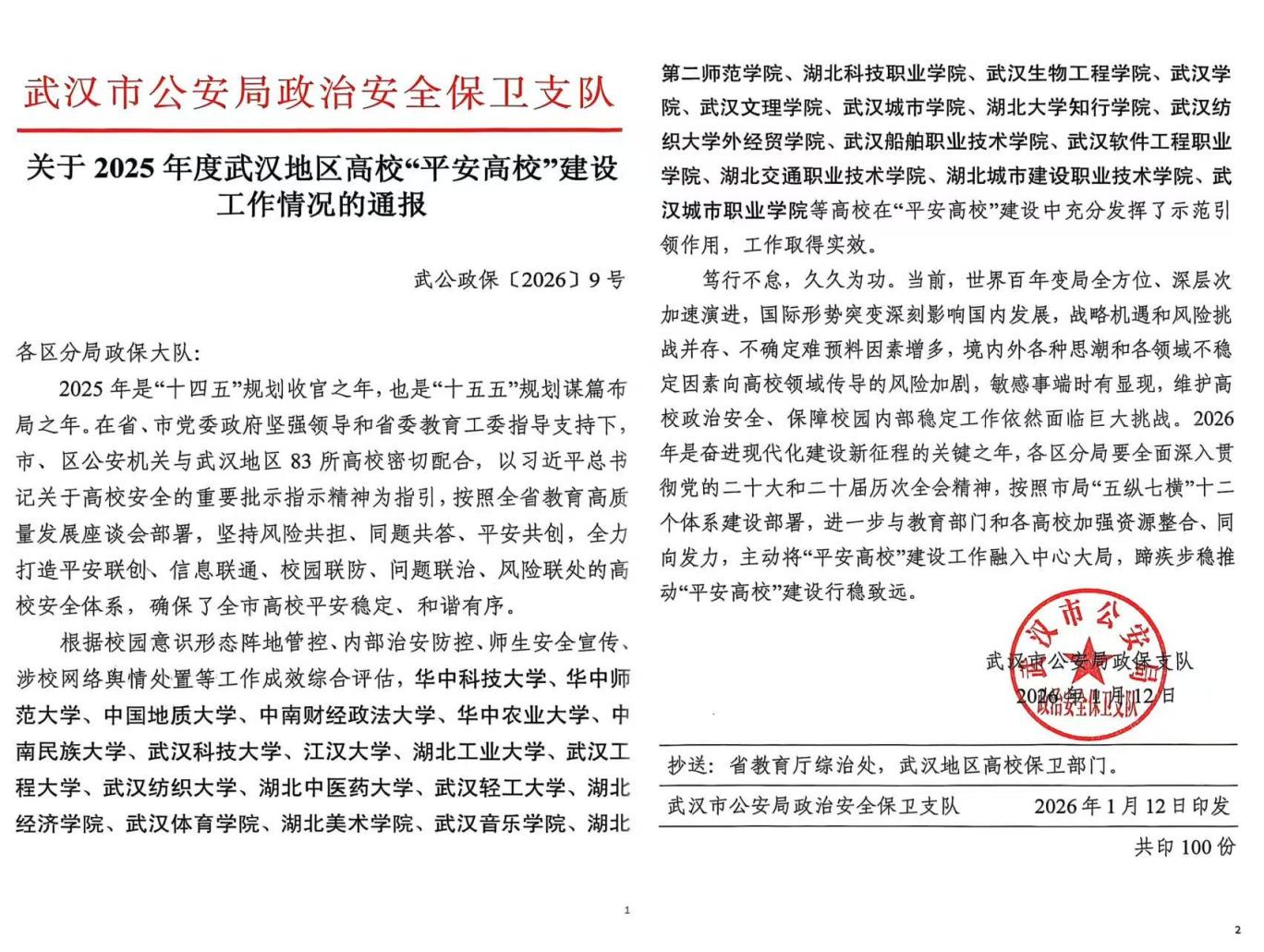 新闻网讯(记者 李向湘)近日,武汉市公安局政治安全保卫支队发布《关于2025年度武汉地区高校“平安高校”建设工作情况的通报》,我校凭借扎实的校园安全防范工作与显著成效,成功入选武汉地区“平安高校”建设示范引领高校名单,这是市级公安部门对学校安全治理工作的高度认可。