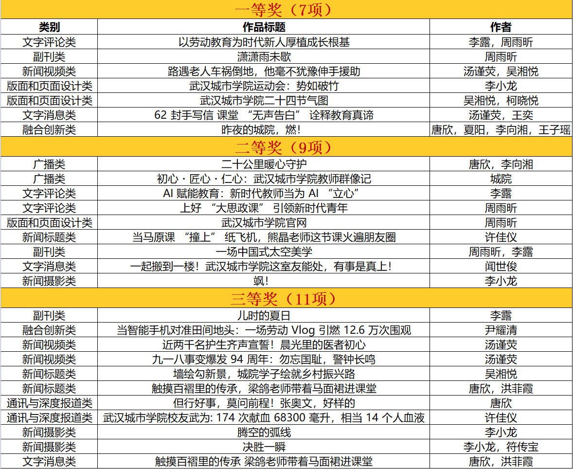 新闻网讯(记者 吴湘悦)近日,2025年度湖北高校新闻奖评选结果揭晓。我校斩获27项奖项,其中一等奖7项、二等奖9项、三等奖11项,获奖总数及一等奖数量均位居省内同类高校首位,创下历史最好成绩。
