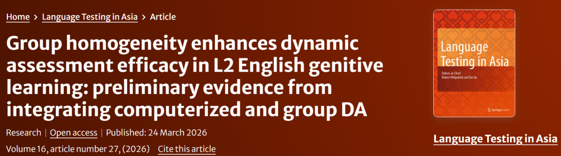 新闻网讯(通讯员:程苏安)近日,外语学部冯赛枫、邹洁两位教师合作完成的研究论文《Group homogeneity enhances dynamic assessment efficacy in L2 English genitive learning: preliminary evidence from integrating computerized and group DA》在国际学术期刊《Language Testing in Asia》正式发表,实现了外语学部在该类别国际期刊发表的突破,为学部应用语言学、语言测试与教学法研究,以及学科建设、教育教学改革提供了高水平参考。
