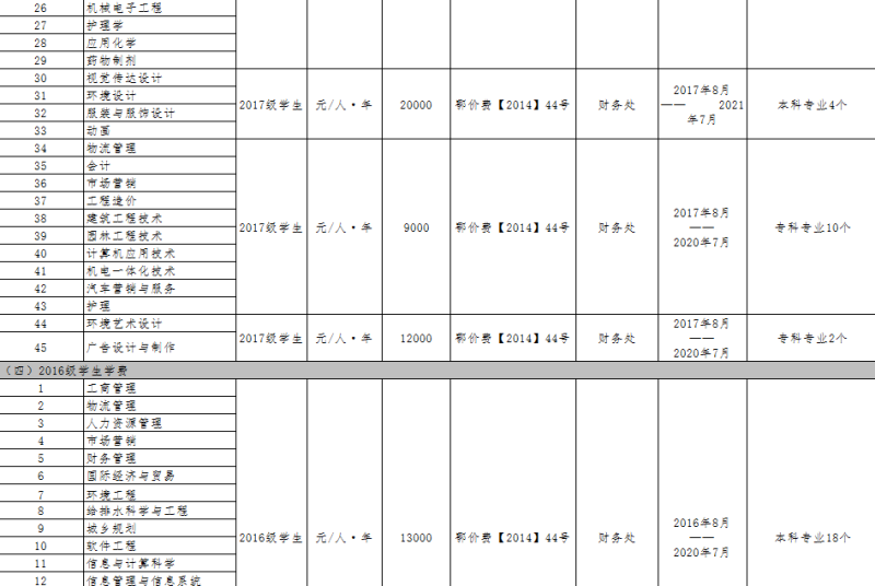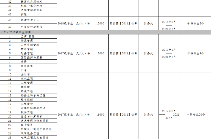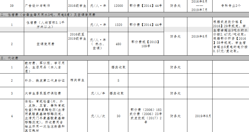 武汉科技大学城市学院2019年度收费目录清单