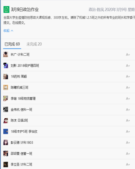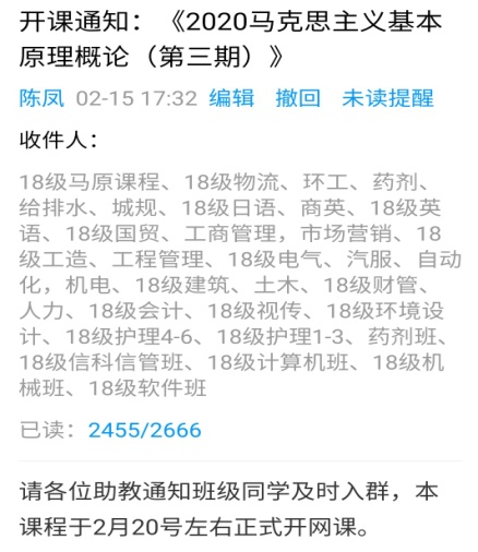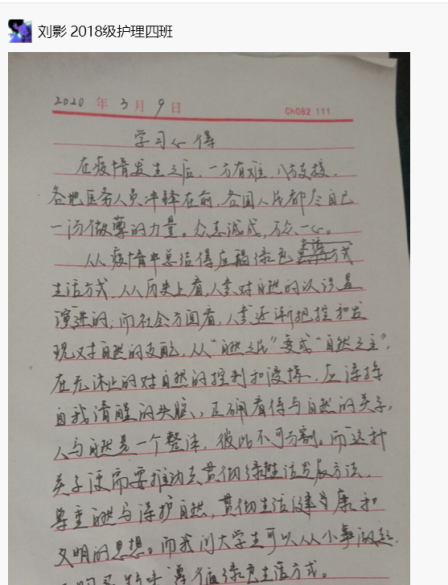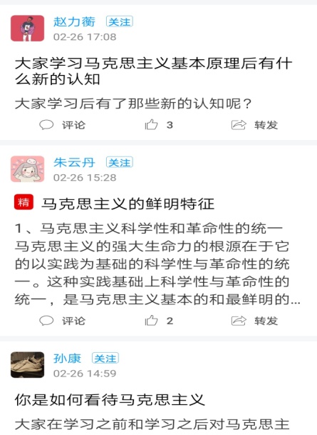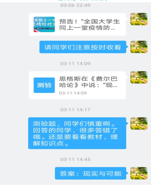 2018级机械专业学生王鸿春说:“虽然是网上教学,但老师负责,让我们更好地了解了马克思主义,也使我们更加深刻地认识到了《马克思主义基本原理概论》课程的重要性,在疫情面前更加体现得淋漓尽致。”2018级护理班学生江梦婷说道:“老师的课讲得非常好,有不懂的地方老师都会耐心解惑,当任务慢于别人时,老师也会积极地提醒我们。听老师讲课,心会得到宁静。”