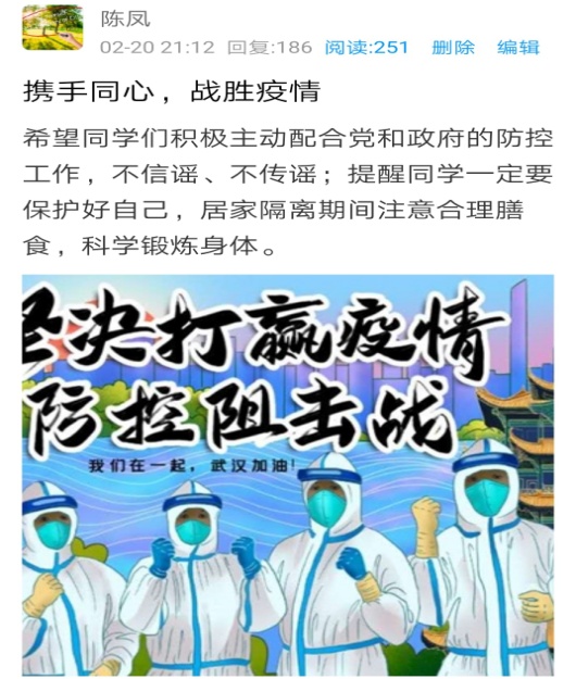 疫情防控的“战场”,是思政课在当下最生动的课堂。 陈凤把理论知识与战“疫”现实有机结合,形成了鲜活的思政教育素材,构建起了对学生们进行思想引领的云端课堂。