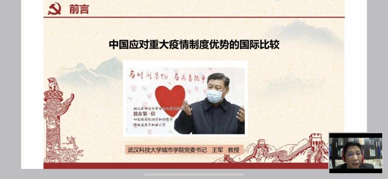 党课上,王军围绕“集中力量办大事是中国制度优越性的集中体现”、“党的集中统一领导是中国政治制度的最大优势”、“中国特色基本经济制度是战胜疫情的坚实基础”、“应对公共危机责任制是战胜疫情的有利支撑”四个方面作了专题讲授。通过对比国内外疫情防控之间的差距,由浅入深分析了集中力量办大事是中国制度优越性的集中体现,我国经济能在疫情期间平稳发展也是因为我国有中国特色基本经济制度的有力保障,应对公共危机责任机制是战胜疫情的有利支撑。疫情防控“大考”中取得的成绩充分彰显了中国特色社会主义制度无与伦比的优越性,中国特色社会主义制度优势和治理效能在抗疫中发挥了决定性作用。当前疫情形势依然严峻复杂,在最吃劲的关键阶段,要进一步利用制度优势“两手抓”,统筹推进学院的抗疫工作和改革发展。